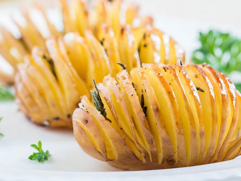- Hold the end of a potato. Use a sharp knife to cut across the potato. Do not cut through the potato, leave at least a ½ inch at the bottom. Continue making slits as thin as you can. Repeat with the remaining potatoes.