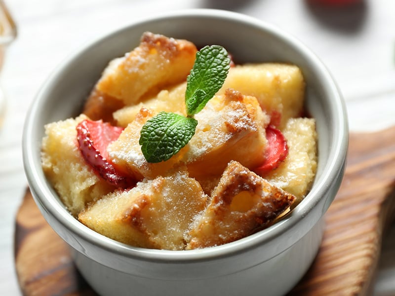 - Meanwhile, slice the strawberries and stir into the bread mixture.