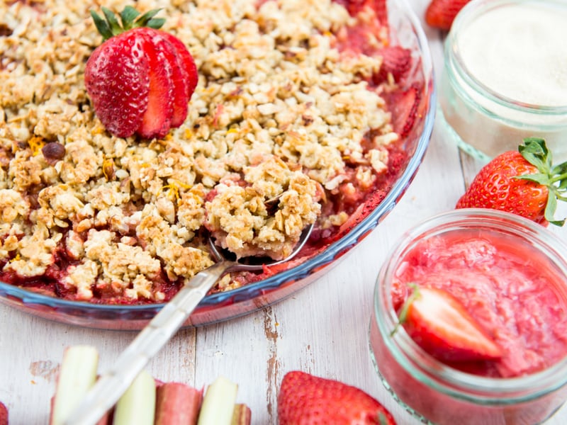 Red fruit bubbling away under a crunchy oat topping — this dessert tastes like summer