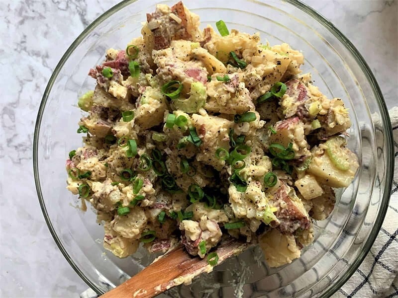 An easy summer salad to go alongside any family supper. Peeling the potatoes AFTER they are boiled is a real time saver.