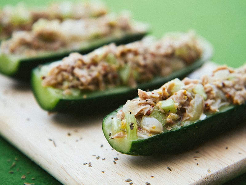 - Fill each cucumber half with the tuna mixture. Serve.
