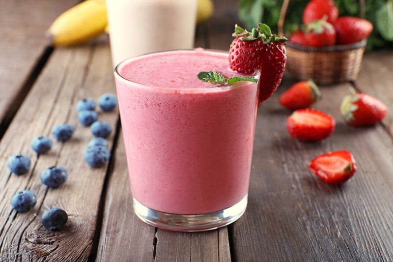 Place 1 cup frozen strawberries, ½ banana and 1/2c frozen blueberries with ½ cup greek or regular yogurt.