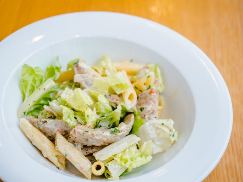 - On the bottom of the bowl place the pasta. Add the lettuce layer then the meat. Sprinkle on parmesan cheese then the almonds or sunflower seeds.