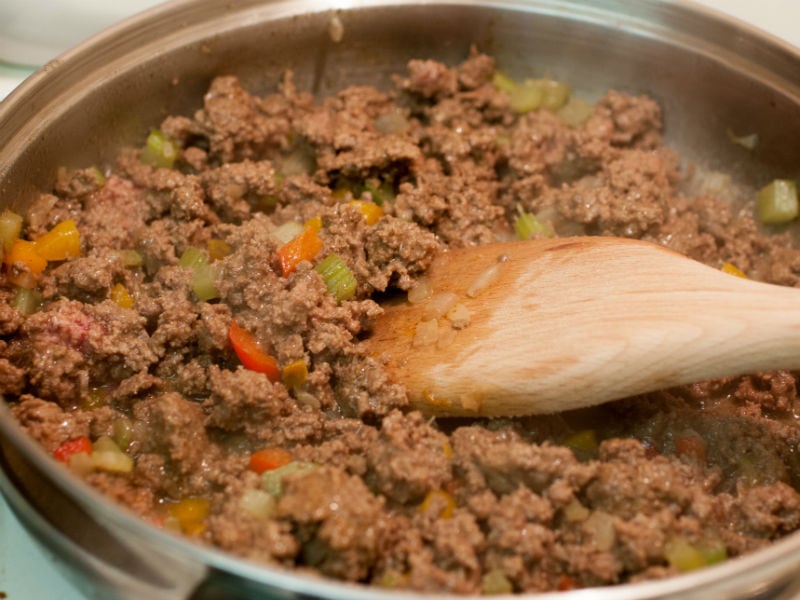 - Brown the ground beef in a large frying pan over medium heat, stirring to break up the beef. Drain the fat.