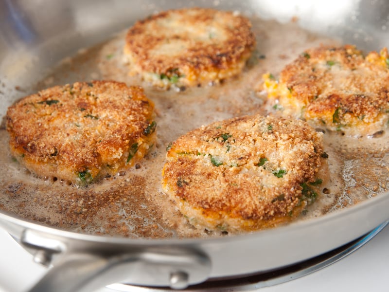 5. Heat 1 tablespoon of oil in a large frying pan. Place croquettes in the sizzling oil. Flip when golden brown. Repeat for the remaining croquettes.
