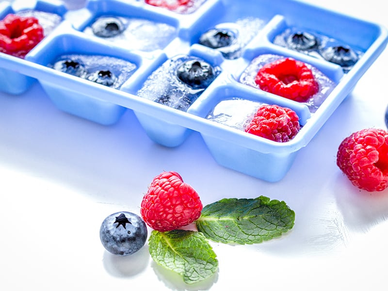 - Place fruit in each slot of an ice cube tray.