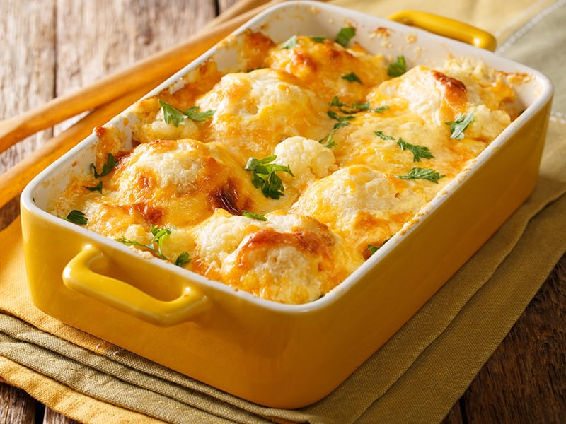 - Once the cauliflower is soft, add the baking dish. Top with the milk mixture.