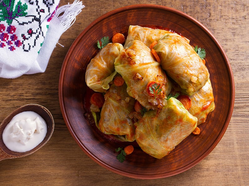 - Remove the foil lid off of the cabbage roll tray.