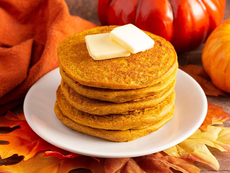 - Important: turn the heat down to low. Once the pancake has set, flip. The heat needs to be low, or the pancake mix will burn very quickly because of the added pumpkin.