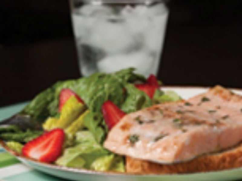 - Top each garlic toast with a piece of salmon and serve with salad & a glass of water.